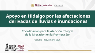 El 10 de octubre de 2025, los estados de Hidalgo, Puebla, Querétaro, San Luis Potosí y Veracruz, fueron afectados por lluvias e inundaciones, provocadas por la perturbación tropical 90-E. El Gobierno de México trabajó en las zonas afectadas para dar apoyo y atención a la población afectada, donde la Secretaría de Gobernación coordinó las acciones de apoyo y atención a la población afectada en Hidalgo. Entre octubre y noviembre de 2025, brigadas de servidores públicos de Coordinación para la Atención Integral de la Migración (CAIMFS), apoyaron en 7 municipios afectados: Atlapexco, Calnali, Huautla, Tepehuacán de Guerrero, Tlanchinol, Xochiatipan y Yahualica. |